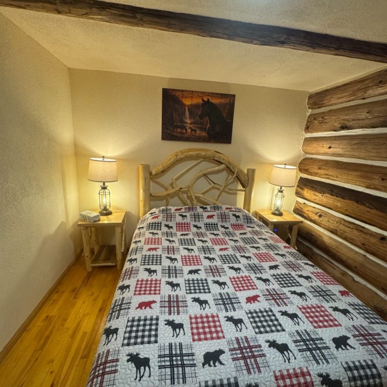 This ground-level cabin offers a queen bedroom, a spacious living room with a queen sofa bed, a dining table, and a fully stocked kitchen. The bathroom includes a walk-in shower, and the highlight is the large, covered wrap-around deck — ideal for watching sunsets, spotting wildlife, or simply soaking in the stillness of nature.